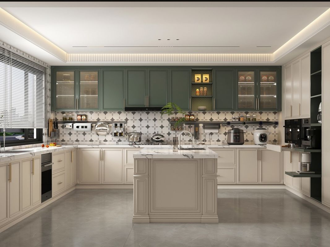 このカスタムキッチンキャビネットは 異なる仕上げ戦略の周りに構築されています ステンレス鋼のキャビネット構造と組み合わせた緑色ですこの組み合わせは,購入者にステンレス鋼のキャビネットから期待される清潔性と設計耐久性を失うことなく,より暖かい贅沢な表現を与える.