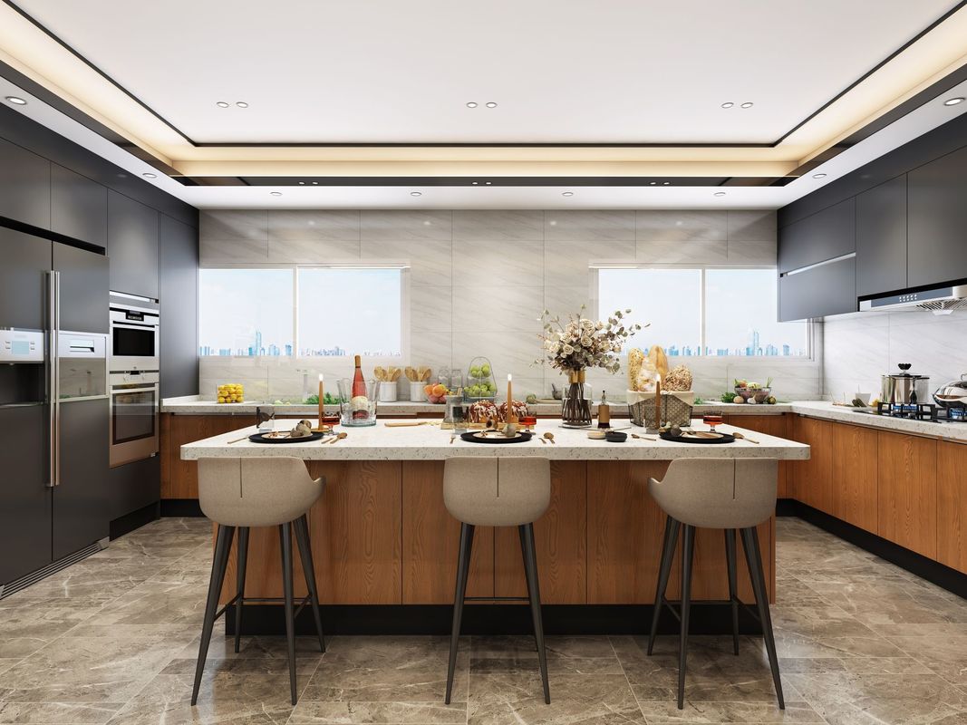 このカスタムキッチンキャビネットは, 異なる仕上げ戦略の周りに構築されています. 木の穀物とステンレス鋼のキャビネット構造が組み合わせられています.この組み合わせは,購入者にステンレス鋼のキャビネットから期待される清潔性と設計耐久性を失うことなく,より暖かい贅沢な表現を与える.