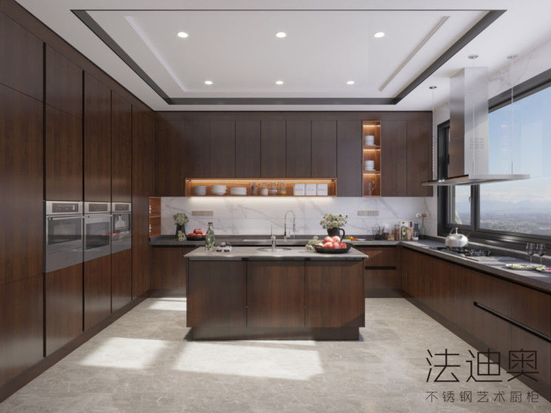 このカスタムキッチンキャビネットは, 異なる仕上げ戦略の周りに構築されています. 木の穀物とステンレス鋼のキャビネット構造が組み合わせられています.この組み合わせは,購入者にステンレス鋼のキャビネットから期待される清潔性と設計耐久性を失うことなく,より暖かい贅沢な表現を与える.