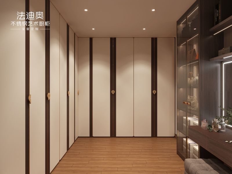 このカスタムワードローブは、差別化された仕上げ戦略に基づいて構築されています。ベージュとステンレス鋼のキャビネット構造の組み合わせです。この組み合わせにより、バイヤーはステンレス鋼のキャビネットに期待される清掃性とプロジェクトの耐久性を失うことなく、より温かみのある高級感を表現できます。