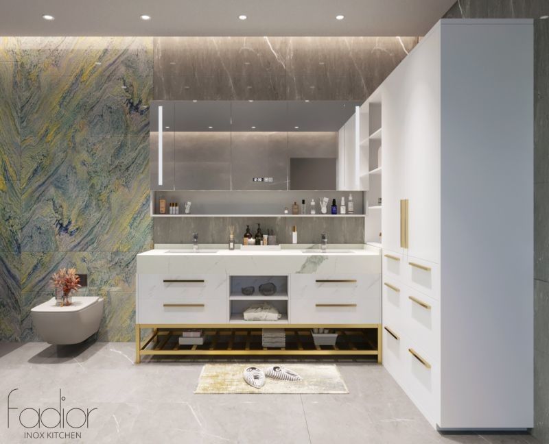 このバスルームバニティは、一般的なSKUではなく、デザイン主導のシステムとして提示されています。ホワイトとステンレススチール製のキャビネット構造を組み合わせて、プレミアムな住宅プロジェクトにより完成されたビジュアルアイデンティティを作成します。