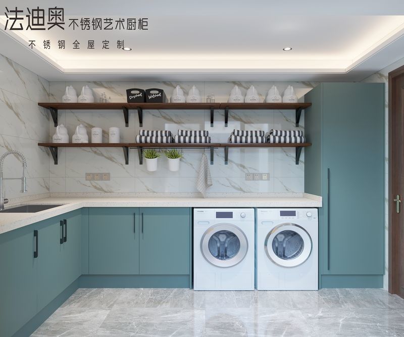 このランドリーキャビネットは、一般的なSKUではなく、デザイン主導のシステムとして提示されています。ティールマットとステンレス鋼のキャビネット構造を組み合わせて、プレミアム住宅プロジェクトにより洗練されたビジュアルアイデンティティを作成します。