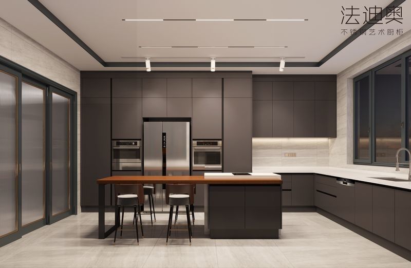 このカスタムキッチンキャビネットは 異なる仕上げ戦略を元に作られています ステンレス鋼のキャビネット構造と組み合わせた黒色ですこの組み合わせは,購入者にステンレス鋼のキャビネットから期待される清潔性と設計耐久性を失うことなく,より暖かい贅沢な表現を与える.
