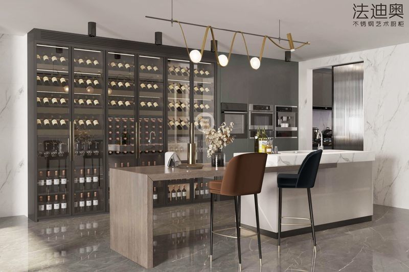 このワインキャビネットは、一般的なSKUではなく、デザイン主導のシステムとして提示されます。グレーとステンレス鋼のキャビネット構造を組み合わせて、プレミアムな住宅プロジェクトにより洗練されたビジュアルアイデンティティを作成します。