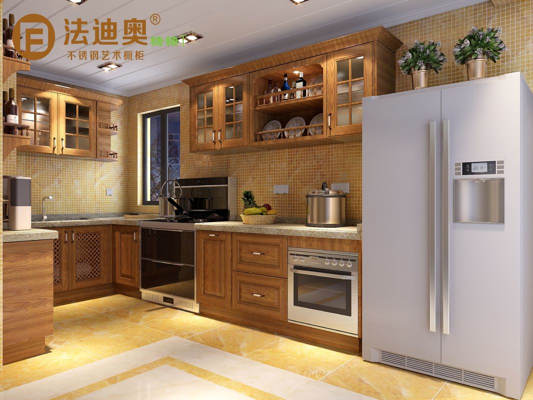 このカスタムキッチンキャビネットは 独特の仕上げ戦略に基づいて作られています 暖かい木色と 繊細なステンレス鋼のアクセントが 現代のインテリアとクラシックインテリアを 兼ね備えていますステンレス鋼のキャビネット構造と組み合わせたこの組み合わせは,ステンレス・スチール・キャビネットに期待される 清潔性と耐久性を失うことなく,購入者により温かい贅沢な表現を与えます.