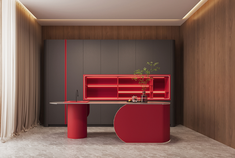 色 | アクセント:マットブラックキャビネット + グロスレッドオープンシェルフ |