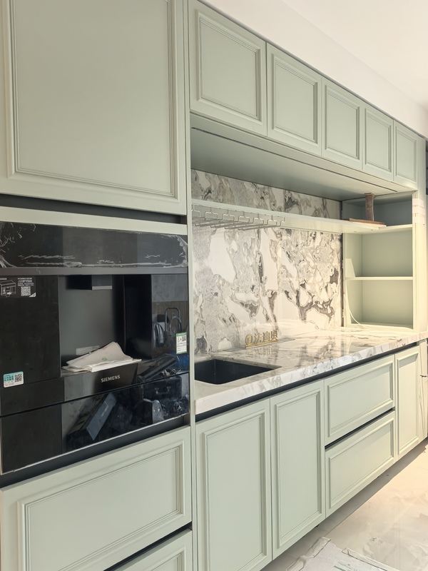 このキッチンキャビネットは、一般的なSKUではなく、デザイン主導のシステムとして提示されています。ベージュ/グリーンとステンレス鋼のキャビネット構造を組み合わせて、プレミアム住宅プロジェクトにより完成されたビジュアルアイデンティティを作成します。レイアウトとホルムアルデヒドフリーは同じ構成の一部であり、デザイナーや開発者がアプライアンス、カウンタートップ、照明が配置されたときのシステムの表示方法を判断するのに役立ちます。