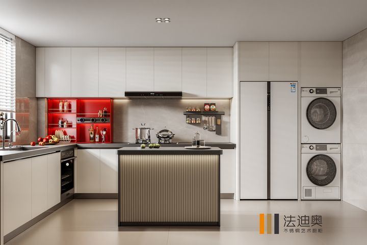 このキッチンキャビネットは,一般的なSKUではなく,デザイン主導のシステムとして提示されています.ステンレス鋼のキャビネット構造と一緒にホワイトを使用して,プレミアム住宅プロジェクトのためにより解消された視覚的アイデンティティを作成します.