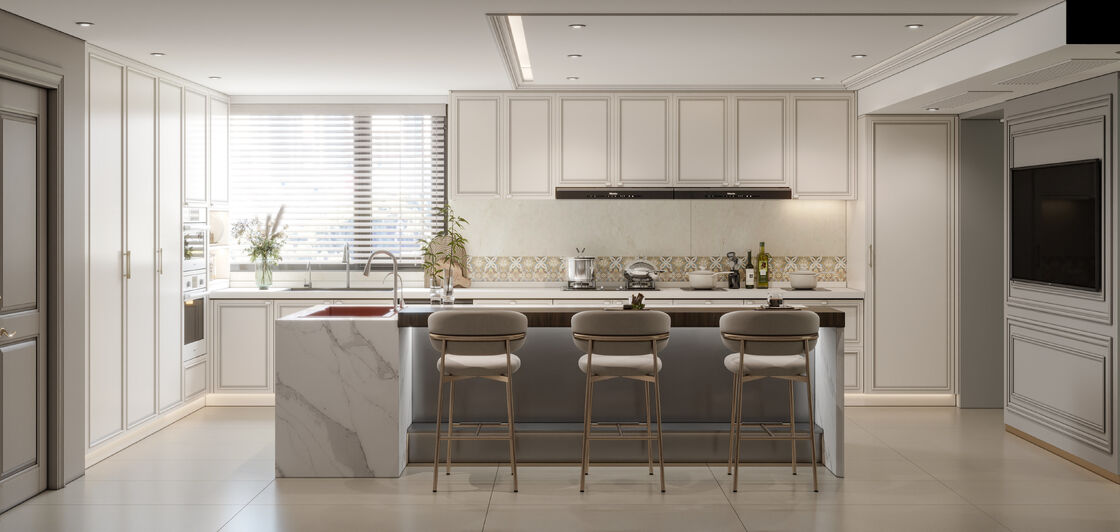 このキッチンキャビネットは,一般的なSKUではなく,デザイン主導のシステムとして提示されています.ステンレス鋼のキャビネット構造と一緒にホワイトを使用して,プレミアム住宅プロジェクトのためにより解消された視覚的アイデンティティを作成します.