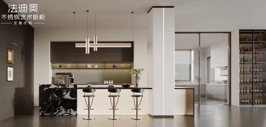 このキッチンキャビネットは,一般的なSKUではなく,デザイン主導のシステムとして提示されています.ステンレス鋼のキャビネット構造と一緒にホワイトを使用して,プレミアム住宅プロジェクトのためにより解消された視覚的アイデンティティを作成します.