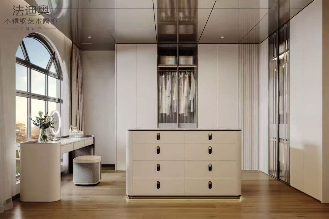 | Q: このモダンミニマリストラグジュアリースタイルのピュアホワイトステンレス鋼ウォークインクローゼットのデザイン言語を際立たせているものは何ですか? 最も強力な手がかりは、ミニマルな仕上げ方向です。これにより、素材の主張を繰り返すだけの一般的なキャビネットリストよりも、ページに明確なデザインの視点が生まれます。 |