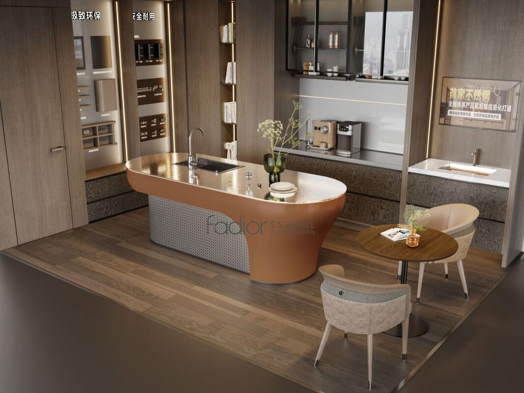 このカスタムキッチンキャビネットは 異なる仕上げ戦略の周りに構築されています ステンレス鋼のキャビネット構造と組み合わせた 層付きプレミアムパレットですこの組み合わせは,購入者にステンレス鋼のキャビネットから期待される清潔性と設計耐久性を失うことなく,より暖かい贅沢な表現を与える.