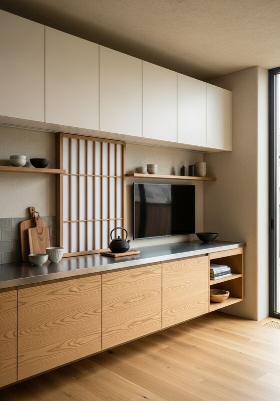 | デザインスタイル | 侘び寂びの素材の温かみを持つ控えめなジャパニーズミニマリズム — 柾目のオーク材が優勢、温かいオフホワイトの控えめな要素、細いダークカラーの構造アクセント、柔らかく拡散した照明統合 |